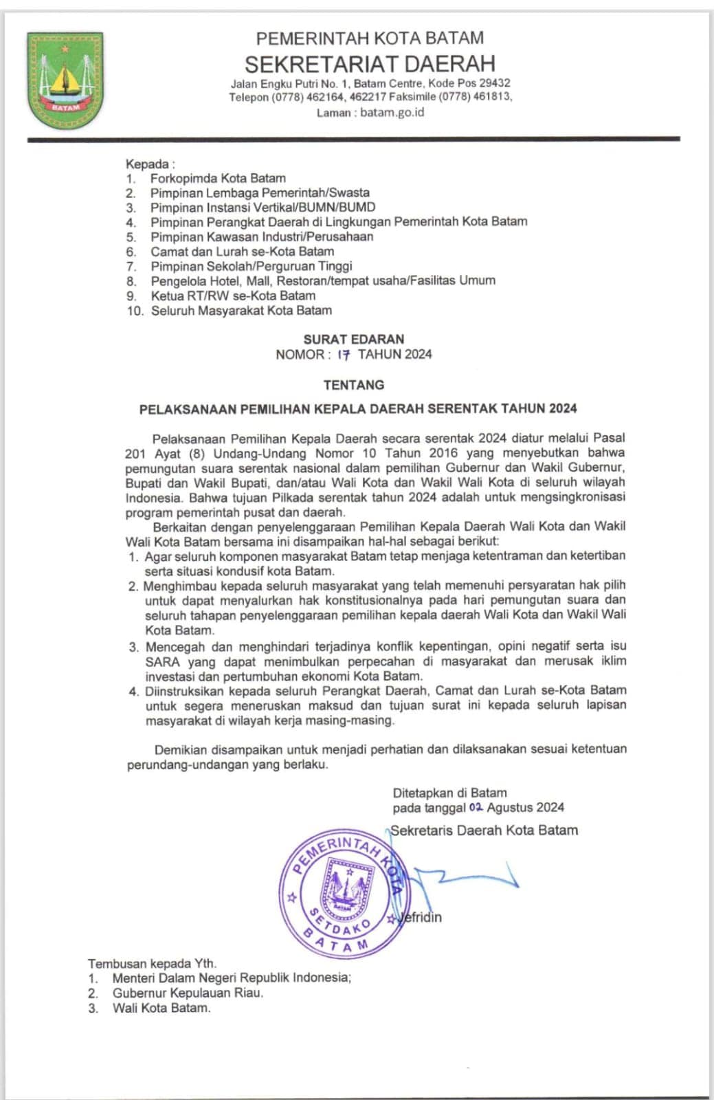 Untuk itu, Pemko Batam mengeluarkan Surat Edaran (SE) Nomor 17/2024, tentang Pelaksanaan Pemilihan Kepala Daerah Serentak Tahun 2024.
