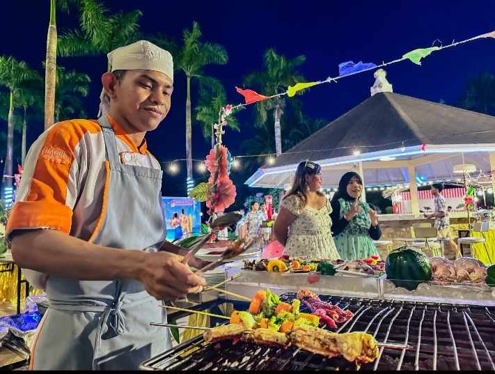 Menu utama acara ini adalah buffet BBQ premium all-you-can-eat yang dirancang khusus oleh eksekutif koki resor. Tamu akan dimanjakan dengan beragam hidangan panggang segar yang dimasak langsung di live cooking station. Mulai dari daging sapi premium seperti Rib-Eye Beef, Sirloin, dan Shortcut Rib, hingga hidangan ayam seperti Honey Soy Chicken Wings dan Chicken Chop, semuanya dipanggang dengan bumbu khas yang menggoda selera. Tersedia juga pilihan makanan laut seperti Fish Brochette dan berbagai sayuran yang ditusuk dan dipanggang—cocok untuk pecinta makanan sehat.