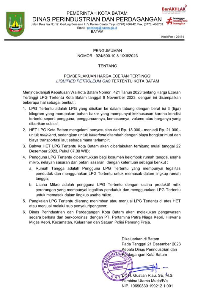 Kepala Disperindag Kota Batam, Gustian Riau mengatakan HET LPG 3 Kilogram di Kota Batam mengalami penyesuian dari Rp18 ribu menjadi Rp21 ribu. HET tersebut berlaku khusus untuk di mainland.